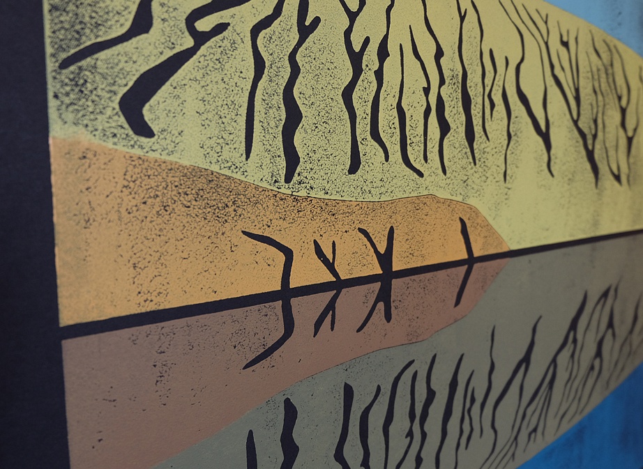 Tříbarevný soutisk linorytu. Autorská grafika. Rok 2011.