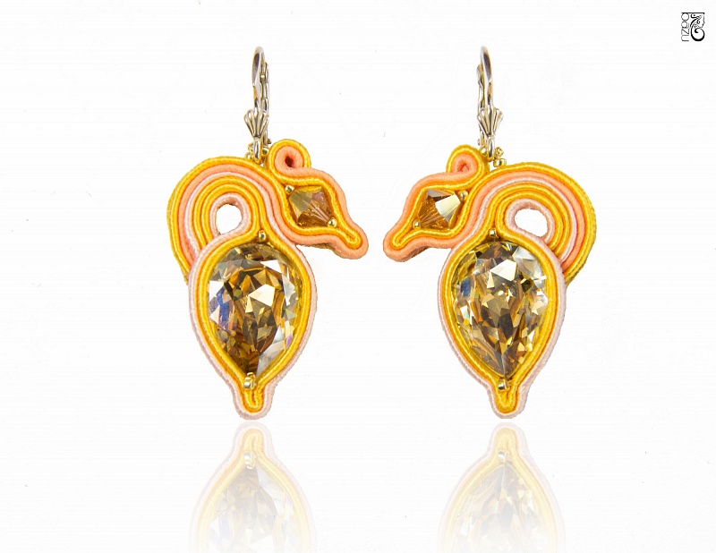 Jednoduché elegantné náušnice z kolekcie Vesna a Večernica v kombinácii farieb žltá-oranžová-lososovoružová- zlatá.