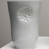 Originální, ručně vyrobené, čistě bílé porcelánové pohárky s malým vyboulením na obou stranách. Na jedné straně má pohárek hladké vyboulení, na druhé je vyboulení s reliéfním dekorem, díky tomu se velmi pohodlně drží.