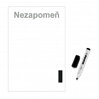 Balení obsahuje samolepicí bílou tabuli 25x30 cm a fix na tabule přidělaný na suchý zipem na tabuli.
